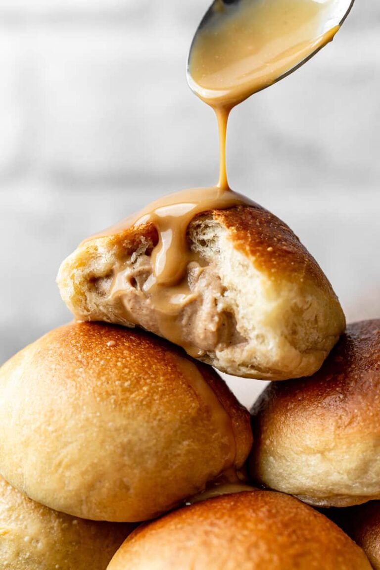 To make caramel sauce, simply add all the ingredients in a small bowl and stir with a spoon until smooth and creamy. That’s it! Drizzle the caramel sauce on the filled doughnuts before to enjoy.