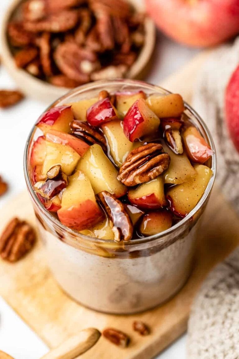 These apple pie overnight oats have everything from your favorite fall dessert in the form of a cozy and healthy breakfast! Creamy overnight oats are topped with warm tender caramelized cinnamon apple and pecan nuts. They’re super quick and easy to make the day before, and can be meal prep for the week!