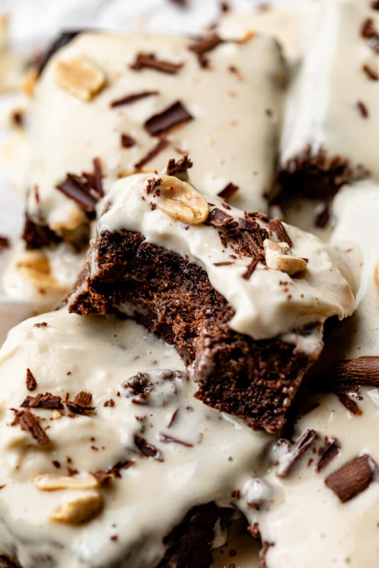 - Once the brownies has completely cooled, put the peanut butter frosting on top and spread it with a spatula. Sprinkle with roasted peanuts, chocolate shaves and a pinch of sea salt flakes. Cut in slices and enjoy!