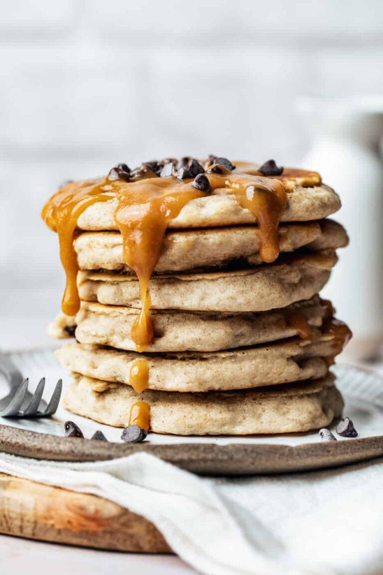 These gluten free pancakes are loaded with chocolate chips, so they’re basically already delicious by themself. But don’t get me wrong, pancakes are always better garnished with some of our favorite toppings! Personally I like to keep it simple and top my pancakes with a drizzle of maple syrup or my homemade caramel sauce, and add fresh fruits like blueberries or banana. Other suggestions include:
