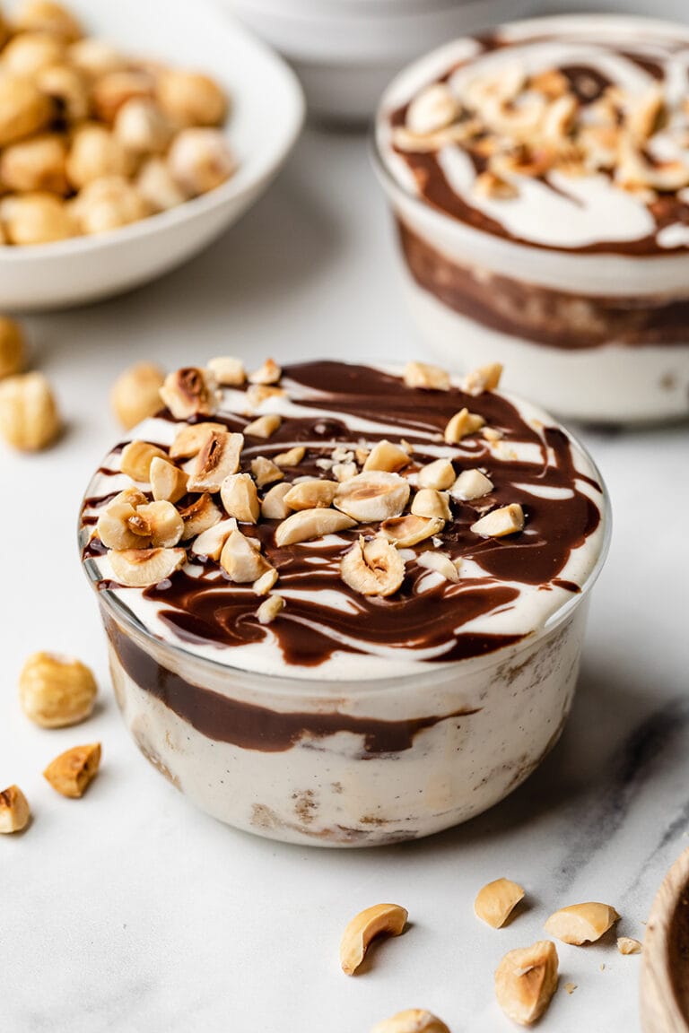 These tiramisu cups are made of layers of fluffy genoise cake soaked in brewed coffee, a super smooth and creamy no-bake cashew cream, and an easy hazelnut praliné sauce. They’re naturally free from gluten, dairy and eggs!