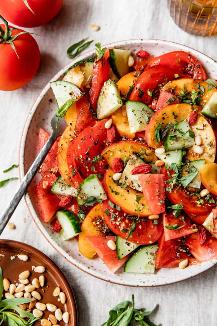 This tomato peach and watermelon salad is my go to recipe for a quick, fresh, light and delicious lunch! It’s loaded with sweet and juicy fruits and veggies, and comes with a light balsamic dressing.