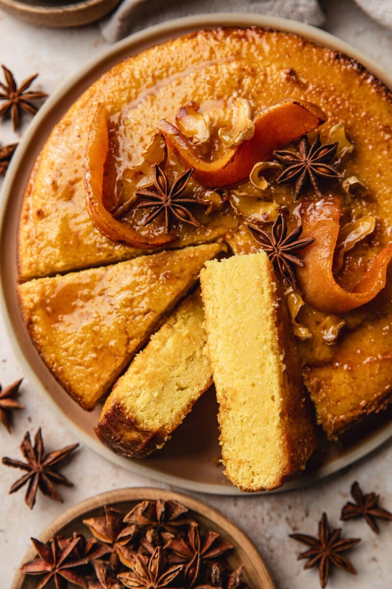- Once baked, remove the cake from the oven and immediately brush the top with the syrup. Leave the cake to cool completely and the syrup to dry. Decorate the cake with the candied fruits and star anise, and enjoy!